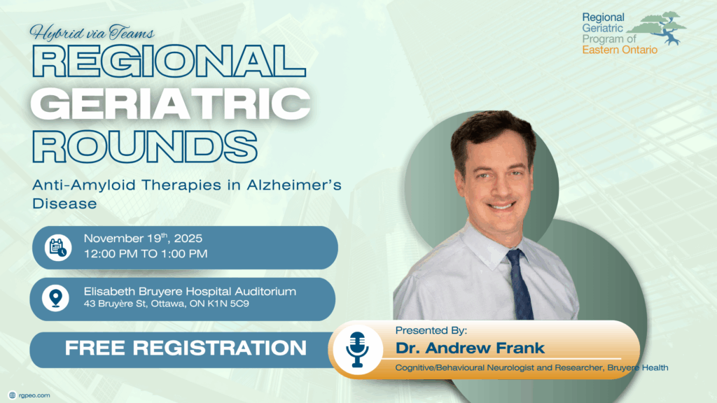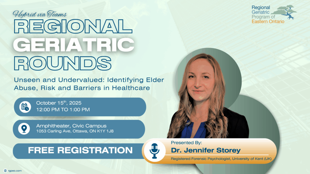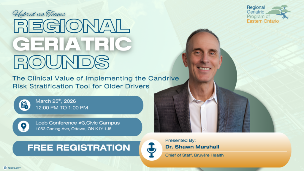 Regional Rounds offer health professional working with older adults – including physicians, nurses, primary care provider, allied health professionals, and others – with updates on best practices, initiatives, and latest findings. These sessions held at The Ottawa Hospital Civic Campus Amphitheatre and are also broadcast virtually across the region, feature a 45-minute presentation followed by a 15 minute Q&A.